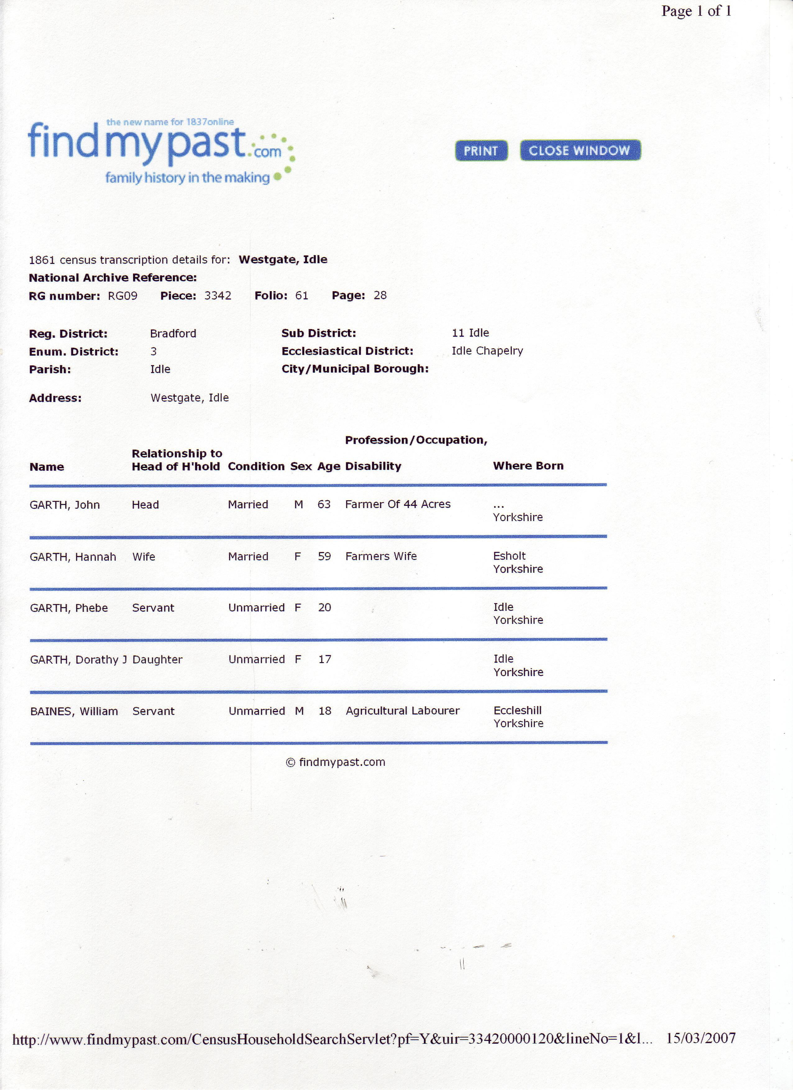 Home Surname List Name Index Sources Email Us | Pedigree Chart | 2 John Birch GARTH | 4 John GARTH  | 8 | | b: m: d: | | b: 12 March 1797 in Barnard Castle, Durham, England64,65,66 m: 3 April 1820 in Calverley Parish, West Riding, York, England67,68 d: 10 November 1872 in Idle Bradford Yorkshire64,65,69 | 9 | | b: d: | | b: about 1830 in Metheringham, Lincolnshire, England4,65,70,71,72 m: 26 September 1885 in Woodhouse, St Mark, Yorkshire, England4,52 d: September 1903 in Dewsbury, Yorkshire West Riding65,71 | 5 Elizabeth DAWSON | 10 | | b: m: d: | | 1 John Birch GARTH  | b: about 1806 in Yorkshire, England73 d: January 1853 in Idle, Yorkshire, England | 11 | | b: d: | | | | b: 3 March 1860 in Leeds, Yorkshire, England1,2,3,4,5,6,7 m: 7 March 1885 in St Marks Church, Woodhouse Lane Leeds8 d: June 1946 in Leeds, Yorkshire West Riding, England5,9 | 6 Thomas Ottoman PRESTON | 12 Thomas PRESTON | | b: 1781 in Darlington, Durham, England74 m: d: | | | 3 Mary Ann SMITH | b: 1 July 1811 in Darlington, Durham, England m: d: October 1887 in Leeds, Yorkshire, England | 13 Mary ILEY |  | b: 1792 in Hilton, Durham, England74 d: | | b: about 1836 in Well, Yorkshire, England4,70 d: 7 December 190275,76 | 7 Frances FENTON | 14 | | b: m: d: | | b: 11 November 1809 in Leeds, Yorkshire, England d: | 15 | | b: d: | |